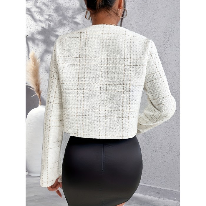 Button Front Plaid Blazer, Elegant Crew Neck Long Sleeve Outerwear, Women's Clothing